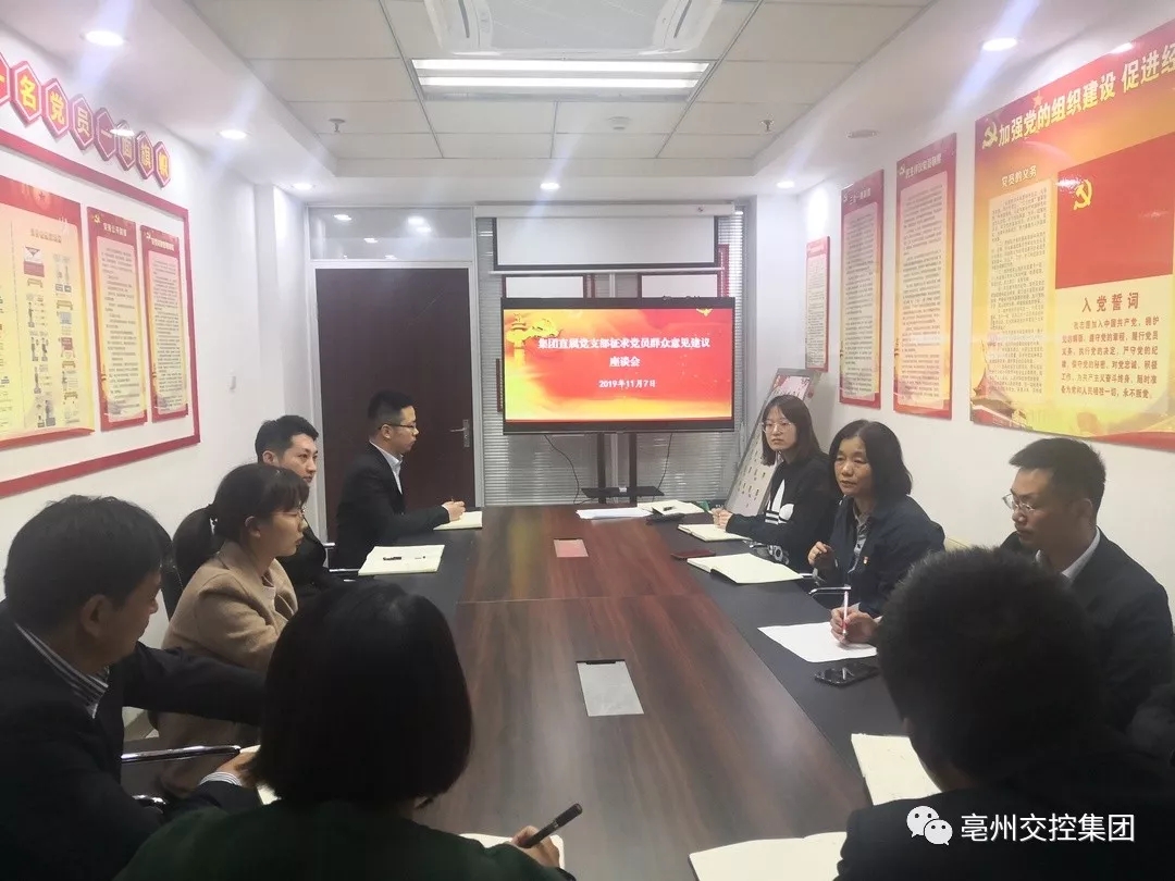 11月7日,集團直屬黨支部召開“不忘初心、牢記使命”主題教育征求意見座談會,面對面聽取黨員群眾對支委班子、支委成員和身邊黨員的意見建議,深入檢視問題,推動整改落實。