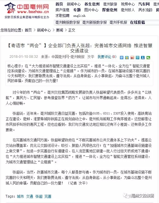 亳州晚報2018年1月10日第三版刊登了記者對交控集團戰(zhàn)略發(fā)展部負責人張超的采訪,全文如下: