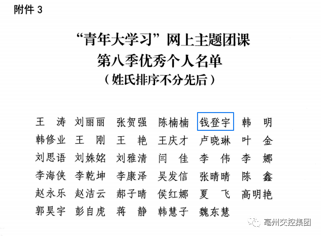 近日,團(tuán)市委印發(fā)了《關(guān)于青年大學(xué)習(xí)網(wǎng)上主題團(tuán)課第八季開展情況的通報》,在47家市直單位(企業(yè))中評選出了4家優(yōu)秀團(tuán)組織,集團(tuán)名列其中;通達(dá)利公司錢登宇獲評優(yōu)秀個人。