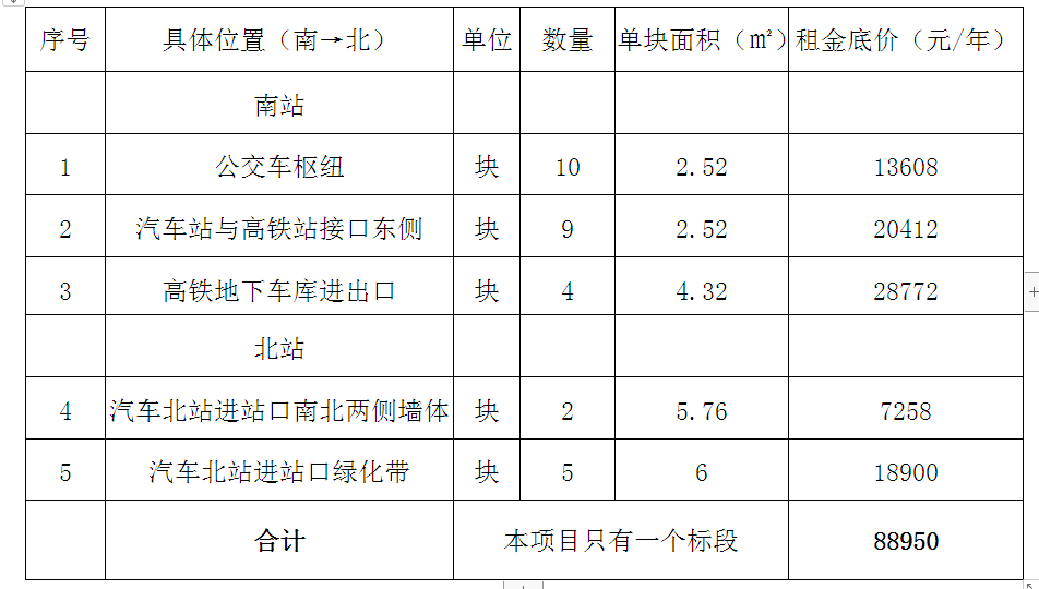 (一)項(xiàng)目概況:安徽通享交通科技有限公司擬對亳州高鐵客運(yùn)樞紐站及亳州北客運(yùn)站新開發(fā)廣告位進(jìn)行招租,位置、面積、競價(jià)起始價(jià)等具體情況如下表所示: