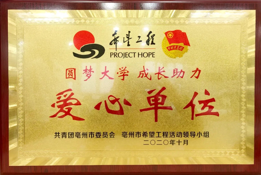 近日,集團(tuán)被共青團(tuán)亳州市委員會、亳州市希望工程活動領(lǐng)導(dǎo)小組聯(lián)合授予“愛心單位”榮譽(yù)稱號。