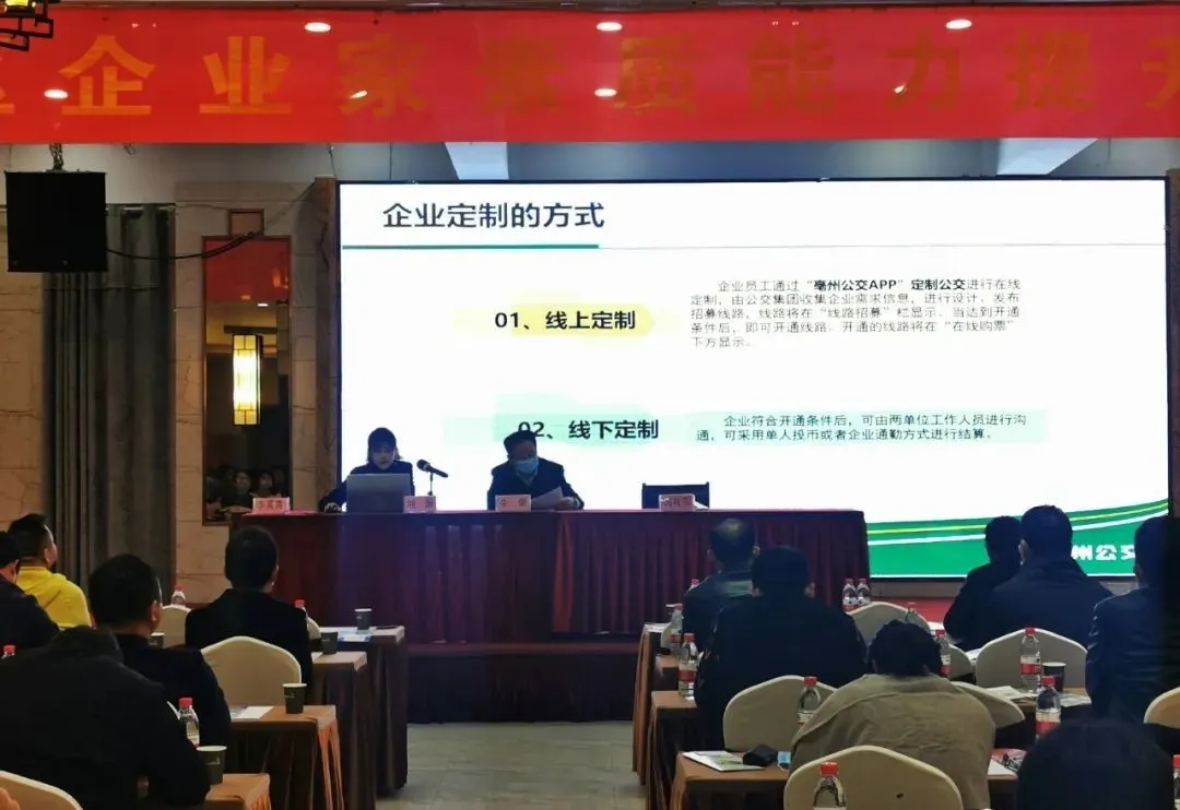 為推進定制公交業(yè)務(wù)的開展,公交集團定制公交推廣小組多次來到譙城經(jīng)開區(qū)管委會進行宣傳,得到了園區(qū)領(lǐng)導的大力支持。近日,在譙城區(qū)企業(yè)家素質(zhì)能力提升培訓會上,推廣小組向企業(yè)家們宣傳推廣定制公交業(yè)務(wù)。在現(xiàn)場,推廣小組成員向大家介紹了定制公交優(yōu)勢、開通條件、開通方式等內(nèi)容,并一一解答了大家的疑惑。