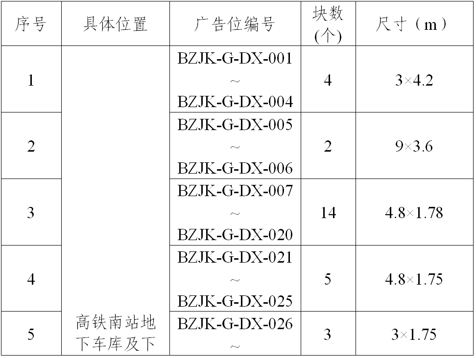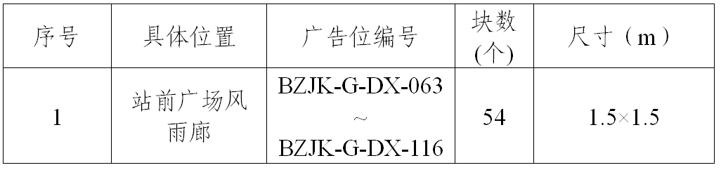 (一)項目概況:安徽通享交通科技有限公司擬對亳州公路客運高鐵樞紐站廣告位競選合作單位,廣告位的位置、面積等具體情況如下表所示: