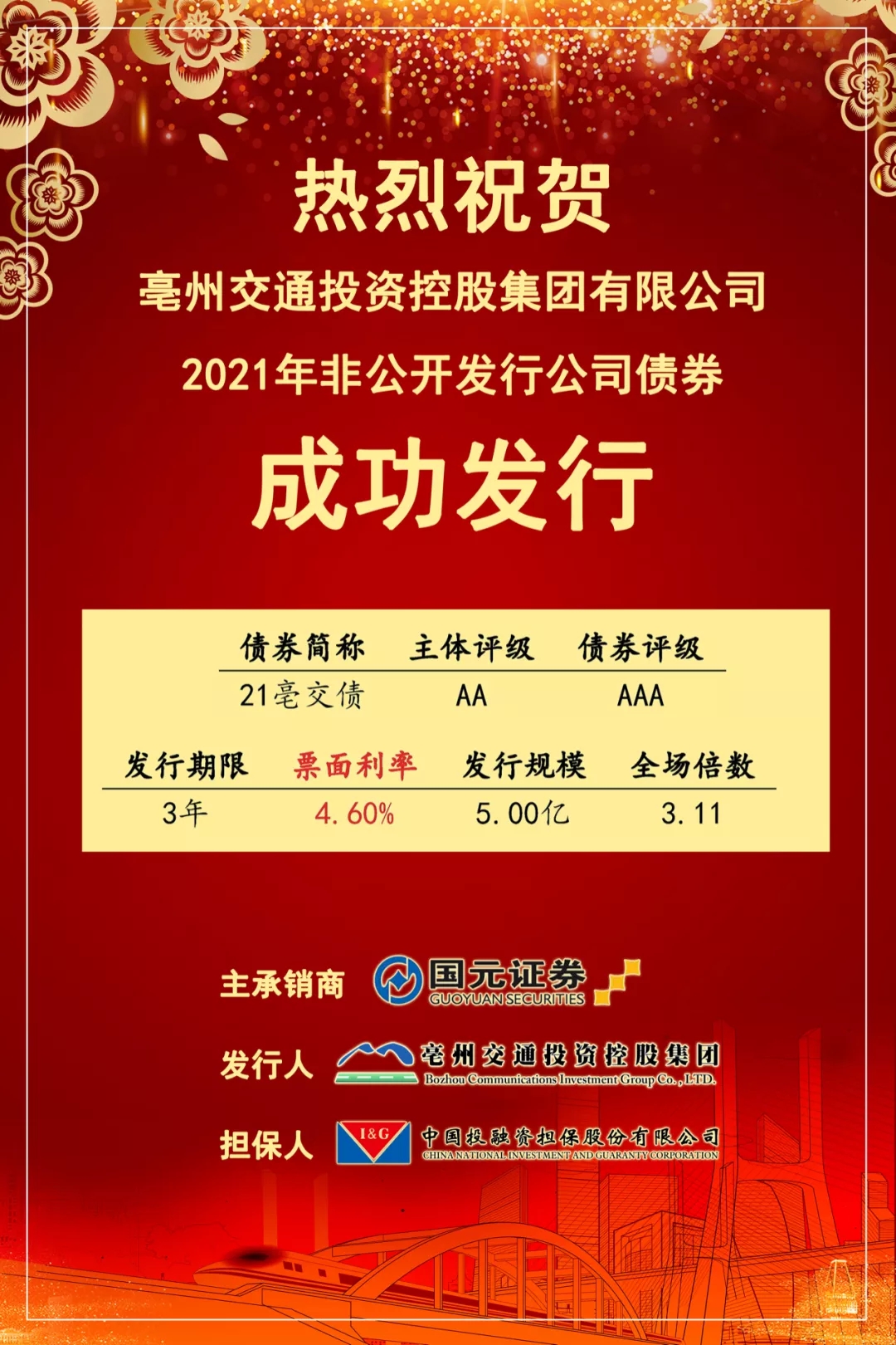 1月20日,亳州交控集團2021年5億元非公開公司債券(簡稱“21亳交債”)順利發(fā)行,票面利率4.60%,全場認購倍數(shù)3.11倍。這是交控集團在資本市場首次亮相,標志著交控集團在直接融資渠道上取得從無到有的歷史性突破。