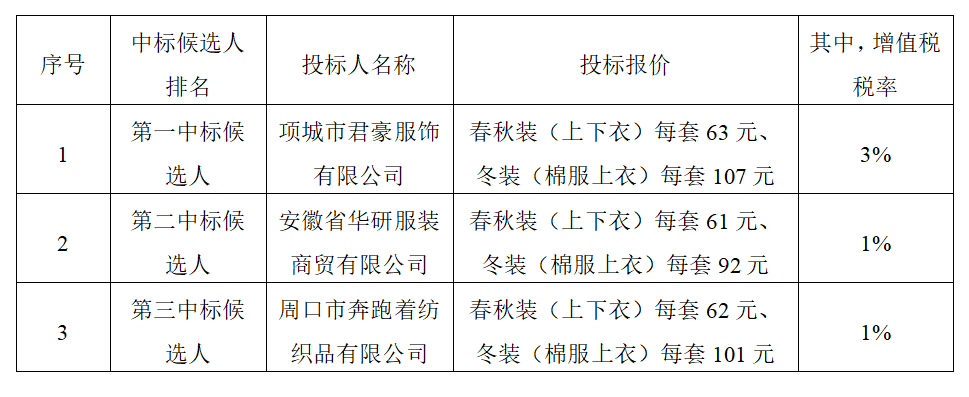 根據(jù)有關(guān)規(guī)定,招標(biāo)人確定項(xiàng)城市君豪服飾有限公司為中標(biāo)人,中標(biāo)價(jià)為春秋裝(上下衣)每套63元、冬裝(棉服上衣)每套107元,交貨期:自接到招標(biāo)人供貨通知后10日歷天內(nèi)提供2000套春秋裝、自接到招標(biāo)人供貨通知后60日歷天內(nèi)提供剩余2000套春秋裝、自接到招標(biāo)人供貨通知后30日歷天內(nèi)完成冬裝供貨,交貨地點(diǎn):亳州市內(nèi),招標(biāo)人指定地點(diǎn),完成本項(xiàng)目投標(biāo)產(chǎn)品的供貨、運(yùn)輸、裝卸、調(diào)換、售后服務(wù)等工作。
