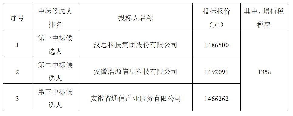 根據(jù)有關(guān)規(guī)定,招標(biāo)人確定漢思科技集團(tuán)股份有限公司為中標(biāo)人,中標(biāo)價(jià)(大寫(xiě))壹佰肆拾捌萬(wàn)陸仟伍佰元,(小寫(xiě))1486500元(其中,增值稅稅率為13%),完成本項(xiàng)目投標(biāo)設(shè)備的供貨、運(yùn)輸、裝卸、技術(shù)支持與培訓(xùn)、售后服務(wù)等工作,并按合同約定履行義務(wù)。
