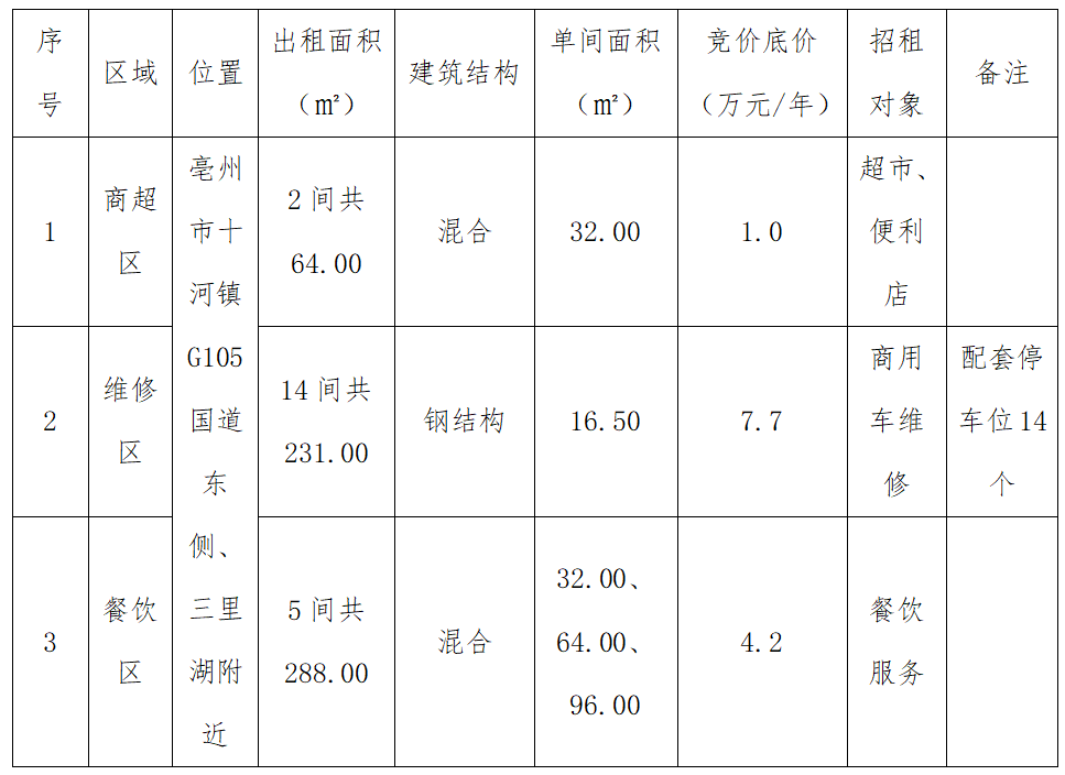 (二)招租范圍:本項(xiàng)目招租對(duì)象商超、汽車(chē)維修、餐飲。招租范圍及競(jìng)價(jià)底價(jià)詳見(jiàn)下表: