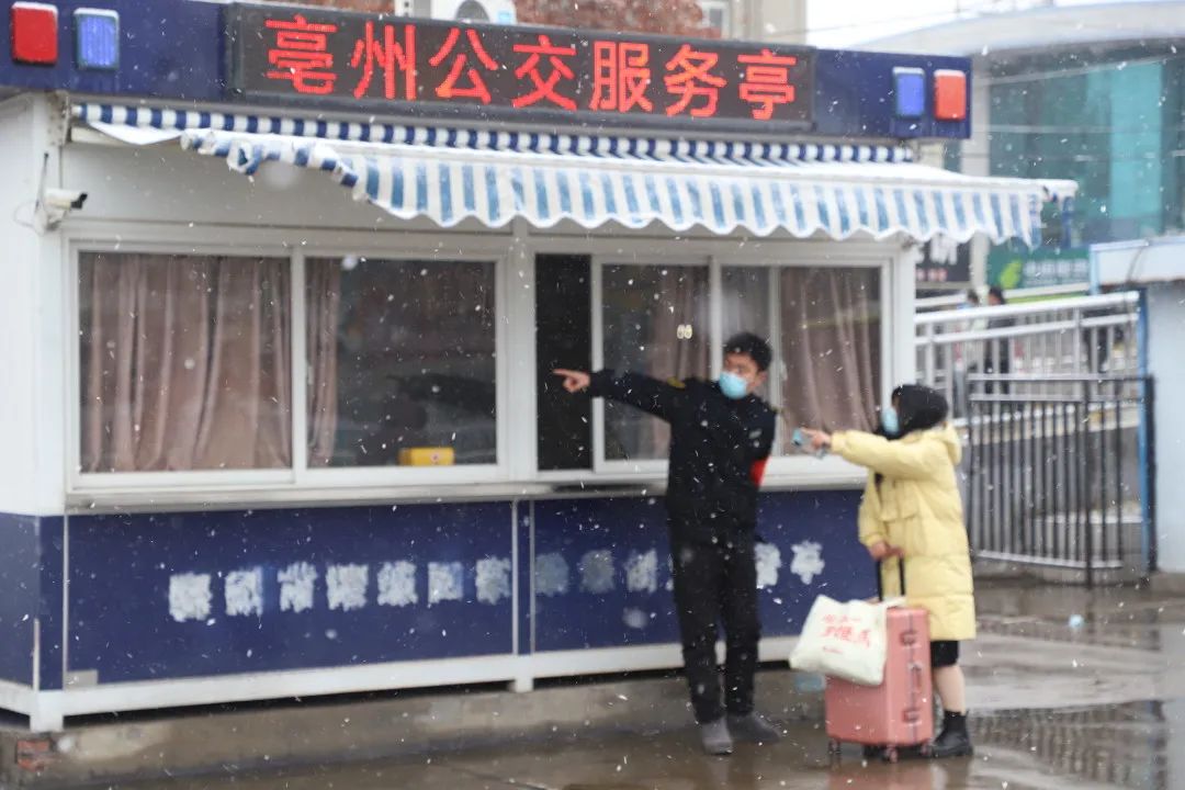 1月14日上午,一場降雪如期而至,給即將到來的兔年春節(jié)增添了不少喜慶氛圍。在火車站站前廣場的亳州公交服務(wù)亭,工作人員正在向一名乘客解答公交線路問題,幫助乘客選擇最佳乘車線路,方便乘客快速到達目的地。