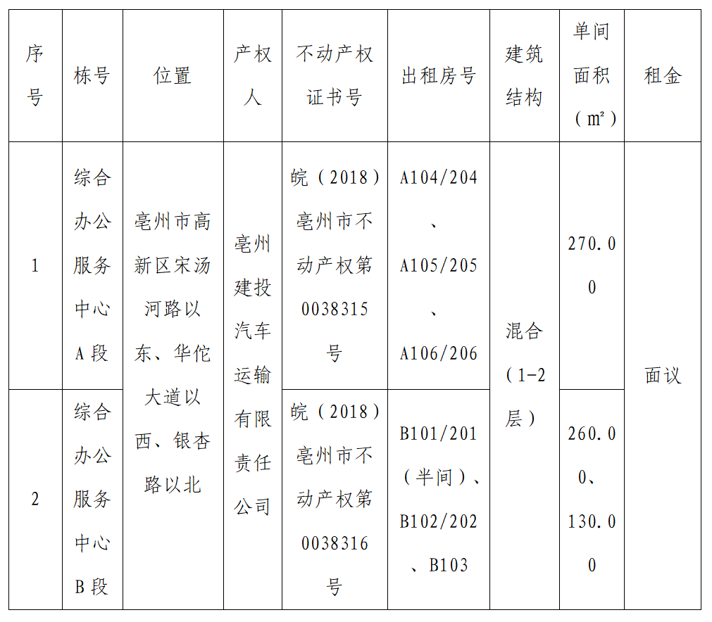 本招租項目為亳州建投汽車運(yùn)輸有限責(zé)任公司綜合辦公服務(wù)中心剩余臨街商鋪,招租人為亳州建投汽車運(yùn)輸有限責(zé)任公司,現(xiàn)對該項目進(jìn)行公開招租。