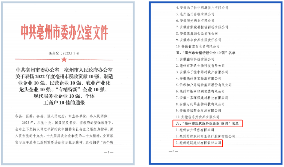 在“亳州市現(xiàn)代服務(wù)業(yè)企業(yè)10強(qiáng)”名單中,通潤建材公司名列第三,這是集團(tuán)下屬子公司首次獲得此殊榮。