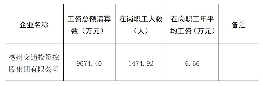 根據(jù)《亳州市市屬企業(yè)工資總額管理暫行辦法》(亳國資管〔2019〕37號)有關(guān)規(guī)定,現(xiàn)將亳州交控集團2020年度工資分配信息披露如下: