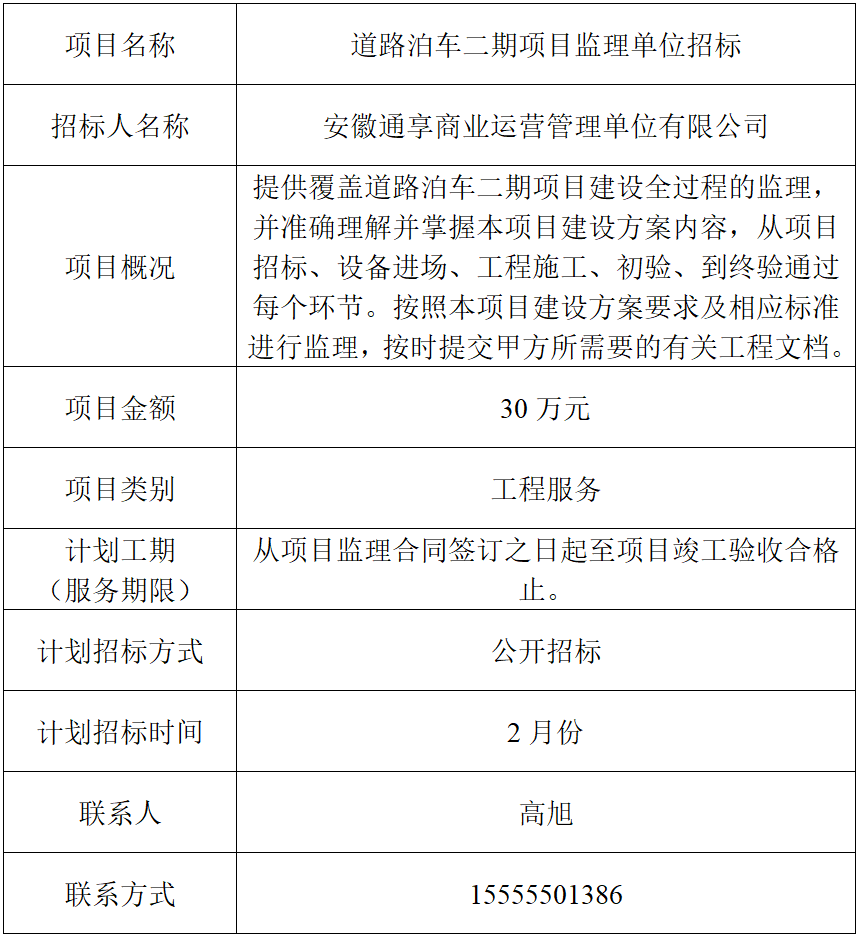 為便于潛在投標(biāo)人及時了解招標(biāo)信息,現(xiàn)將安徽通享商業(yè)運(yùn)營管理單位有限公司(招標(biāo)人名稱)的招標(biāo)計(jì)劃發(fā)布如下: