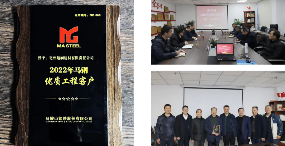 3月22日上午,馬鞍山鋼鐵股份有限公司營銷中心李元水一行蒞臨通潤建材公司,授予其“馬鋼優(yōu)質(zhì)工程客戶”稱號。