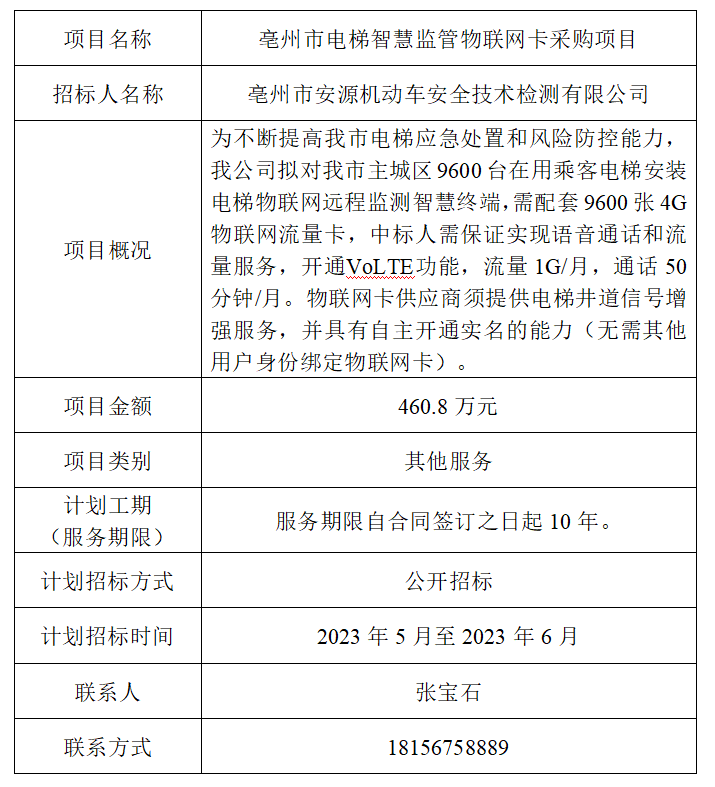 為便于潛在投標(biāo)人及時(shí)了解招標(biāo)信息,現(xiàn)將亳州市安源機(jī)動(dòng)車安全技術(shù)檢測有限公司(招標(biāo)人名稱)的招標(biāo)計(jì)劃發(fā)布如下: