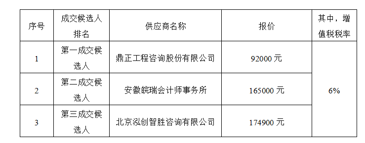 經(jīng)評審,采購人確定鼎正工程咨詢股份有限公司為成交人,成交價為人民幣(大寫)玖萬貳仟元整,(小寫)92000元(其中,增值稅稅率6%),服務(wù)期限:自合同簽訂之日起至項目申報額度全部發(fā)行完成,質(zhì)量標(biāo)準(zhǔn):符合國家、地方、行業(yè)現(xiàn)行相關(guān)規(guī)范合格標(biāo)準(zhǔn),并滿足安徽省財政廳申報要求,按合同約定完成本項目全部工作。