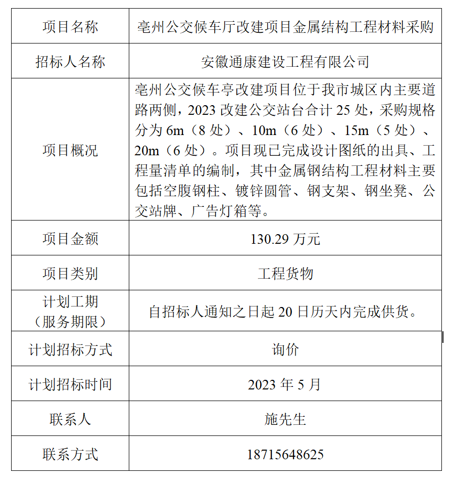為便于潛在投標(biāo)人及時了解招標(biāo)信息,現(xiàn)將安徽通康建設(shè)工程有限公司(招標(biāo)人名稱)的招標(biāo)計劃發(fā)布如下: