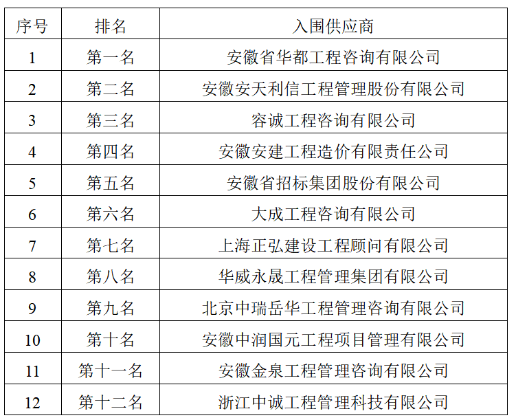 亳州交通投資控股集團有限公司建立工程造價咨詢機構(gòu)庫(項目編號:BZJK-2023-019號)已進行公開招標,我司于2023年6月30日9時組織開標、評標會議,現(xiàn)將入圍結(jié)果公示如下: