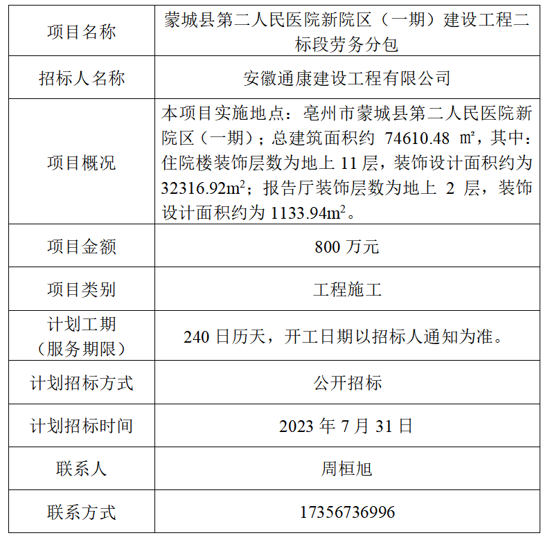 為便于潛在投標(biāo)人及時(shí)了解招標(biāo)信息,現(xiàn)將安徽通康建設(shè)工程有限公司(招標(biāo)人名稱)的招標(biāo)計(jì)劃發(fā)布如下: