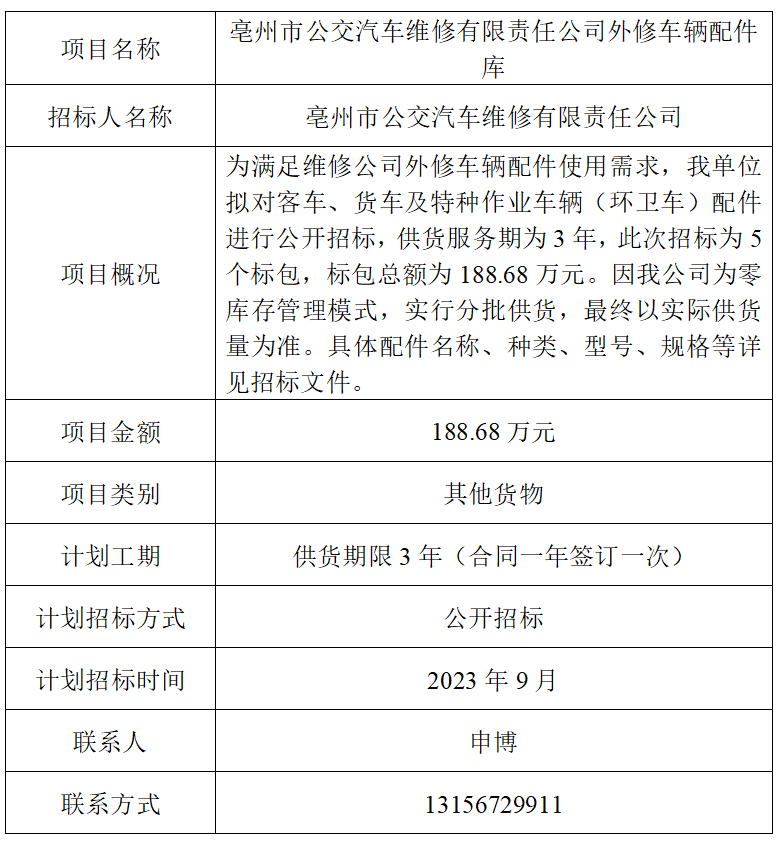 為便于潛在投標(biāo)人及時了解招標(biāo)信息,現(xiàn)將亳州市公交汽車維修有限責(zé)任公司(招標(biāo)人名稱)的招標(biāo)計劃發(fā)布如下: