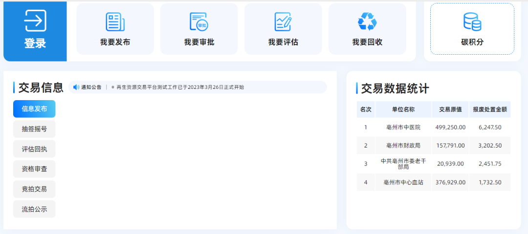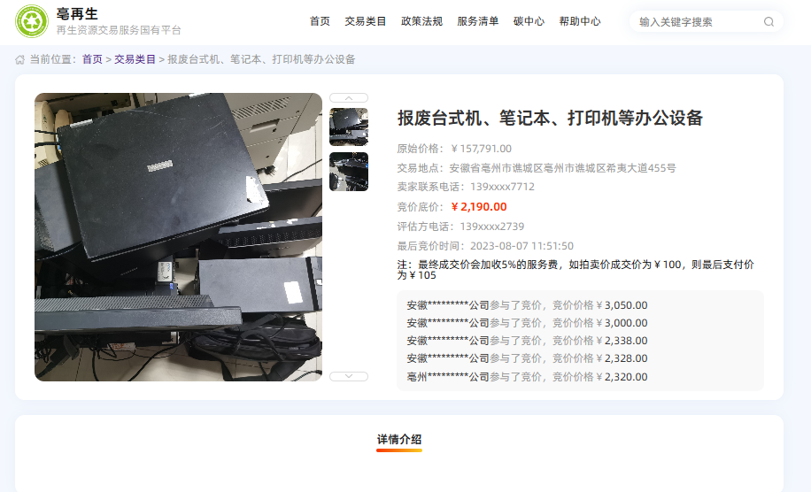 作為市級物資循環(huán)利用交易平臺,目前,“亳再生”交易平臺主要聚焦我市行政事業(yè)單位、市屬企業(yè)等資產(chǎn)處置需求,整合供求信息,精準(zhǔn)匹配內(nèi)容,協(xié)助完成報廢資產(chǎn)的回收處理工作,確保國有資產(chǎn)保值增值。