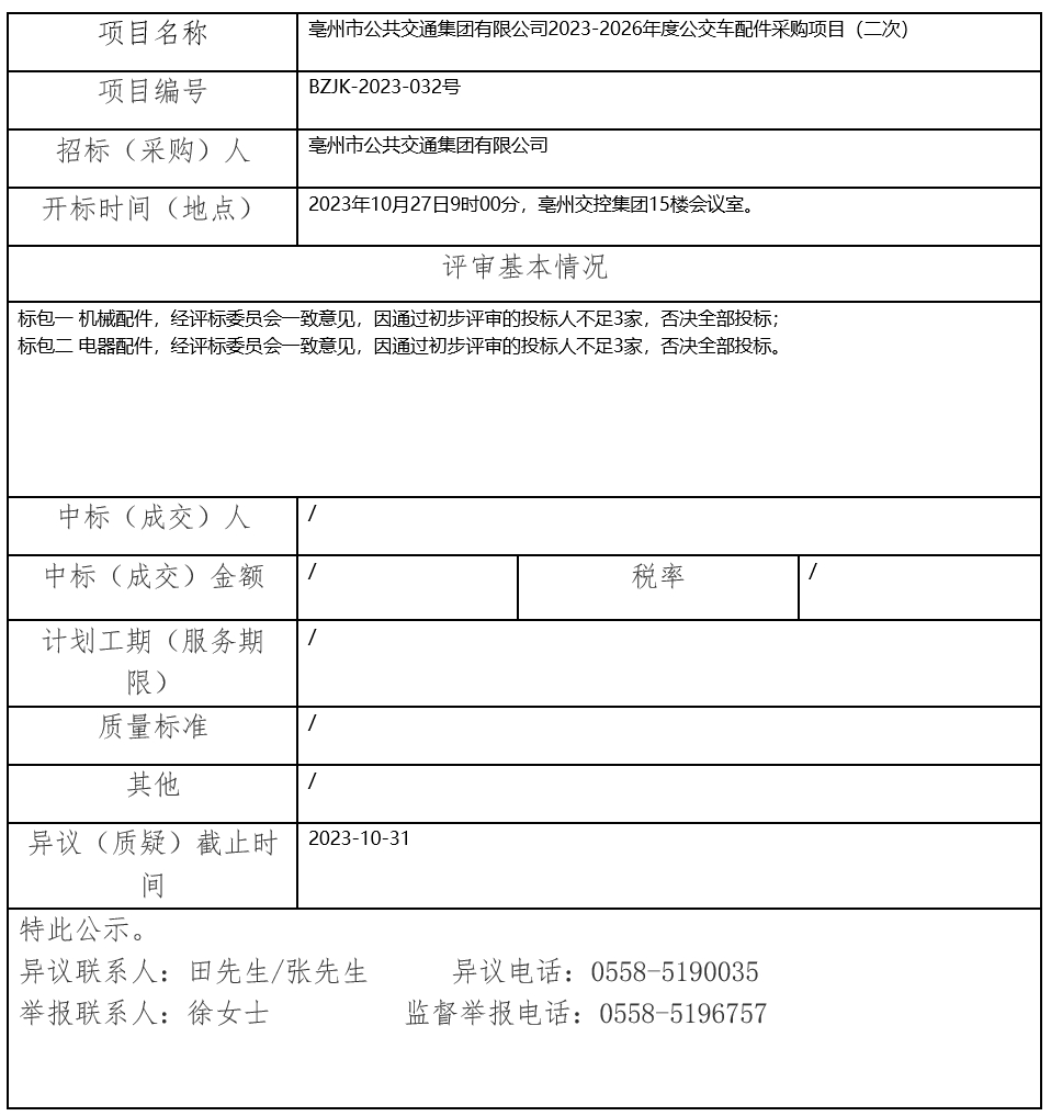 亳州市公共交通集團有限公司2023-2026年度公交車配件采購項目(二次)中標(成交)結(jié)果公示