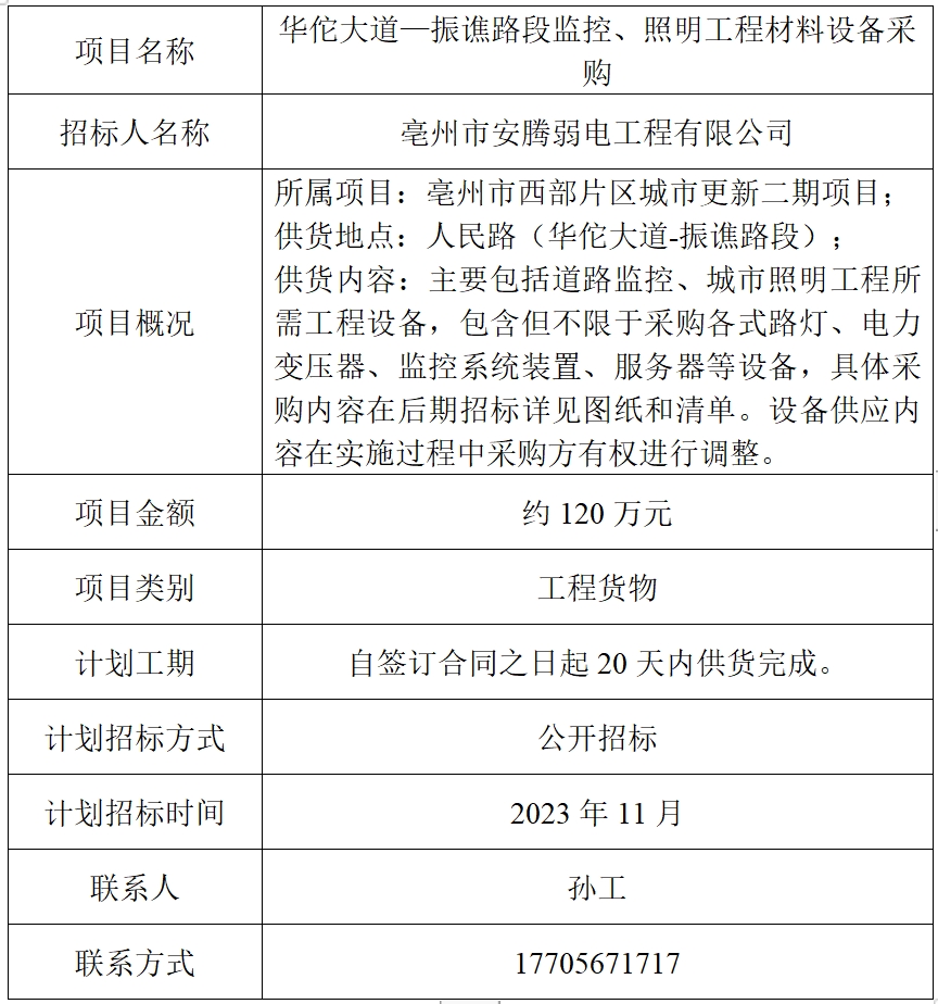 為便于潛在投標(biāo)人及時(shí)了解招標(biāo)信息,現(xiàn)將亳州市安騰弱電工程有限公司(招標(biāo)人名稱)的招標(biāo)計(jì)劃發(fā)布如下: