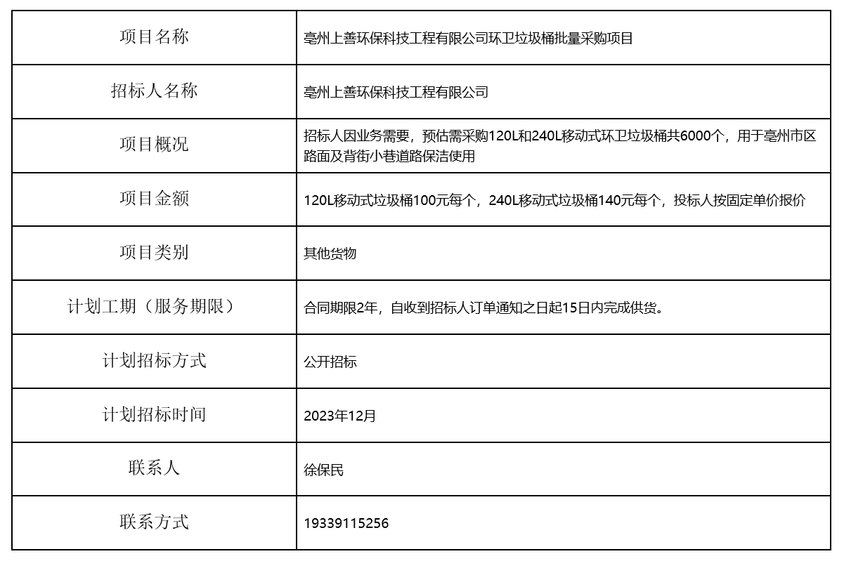 亳州上善環(huán)??萍脊こ逃邢薰经h(huán)衛(wèi)垃圾桶批量采購項(xiàng)目招標(biāo)計(jì)劃
