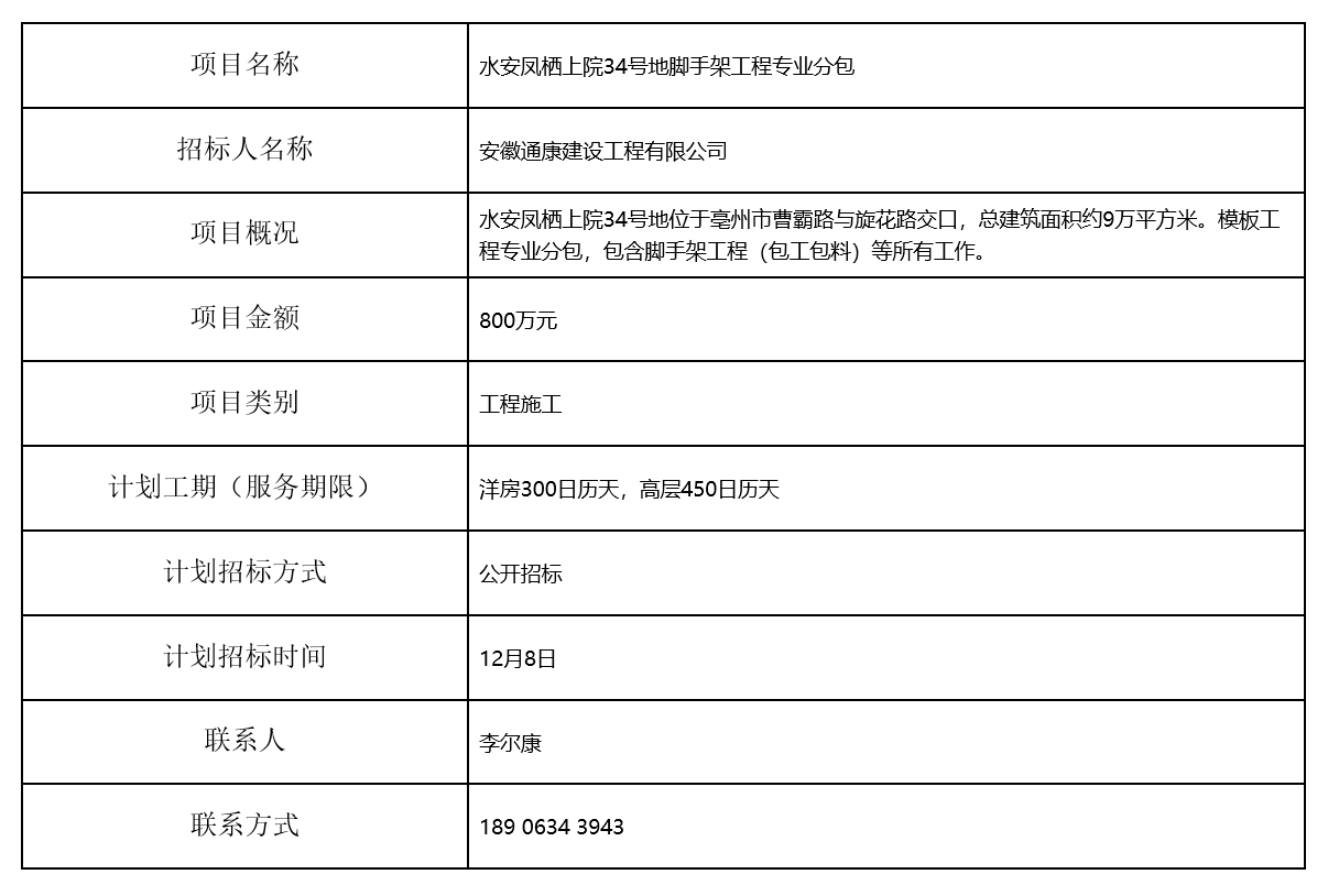 水安鳳棲上院34號地腳手架工程專業(yè)分包招標計劃