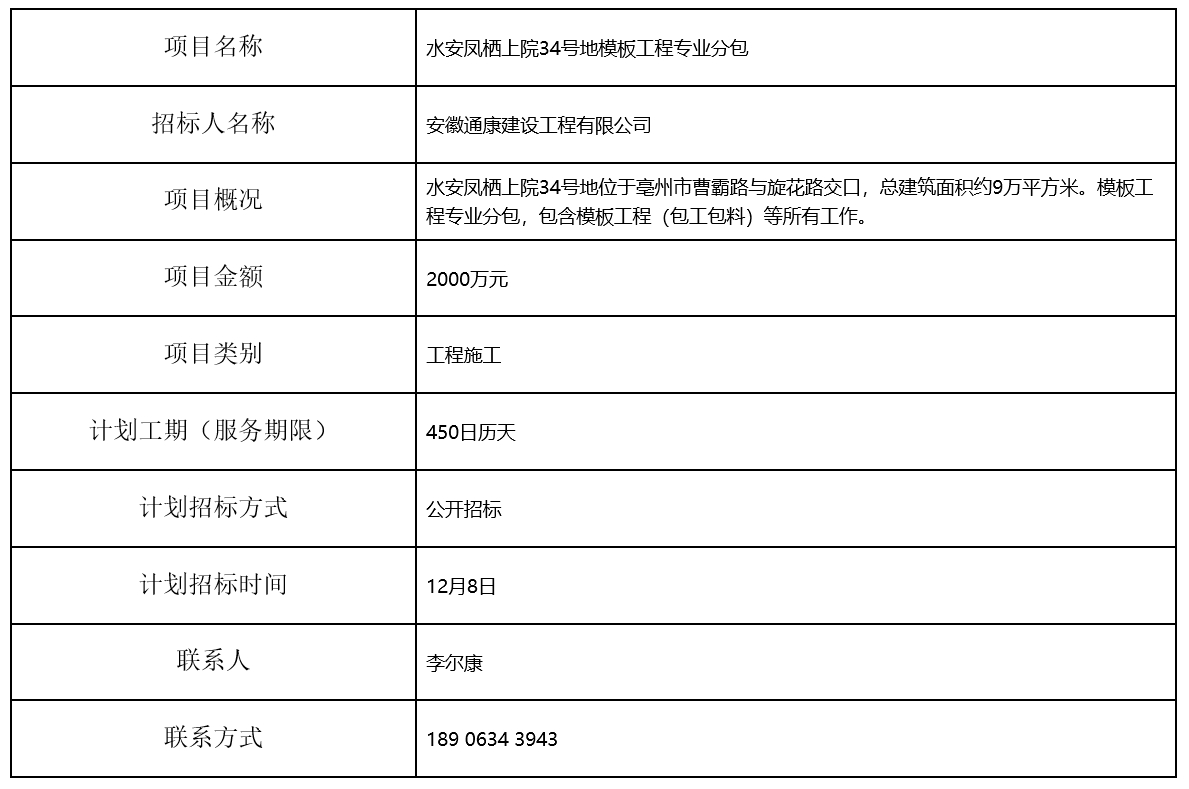 水安鳳棲上院34號(hào)地模板工程專(zhuān)業(yè)分包招標(biāo)計(jì)劃