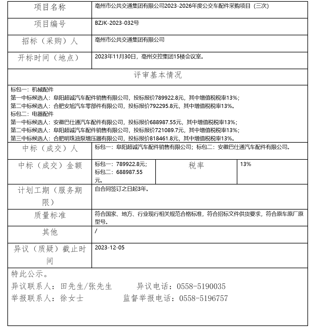 亳州市公共交通集團(tuán)有限公司2023-2026年度公交車配件采購(gòu)項(xiàng)目(三次)中標(biāo)(成交)結(jié)果公示