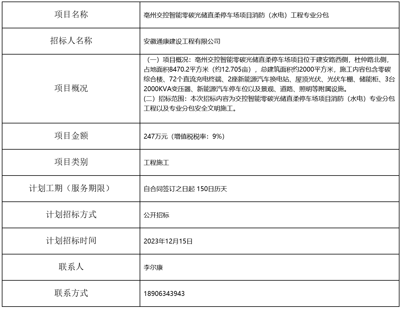 亳州交控智能零碳光儲(chǔ)直柔停車場(chǎng)項(xiàng)目消防(水電)工程專業(yè)分包招標(biāo)計(jì)劃