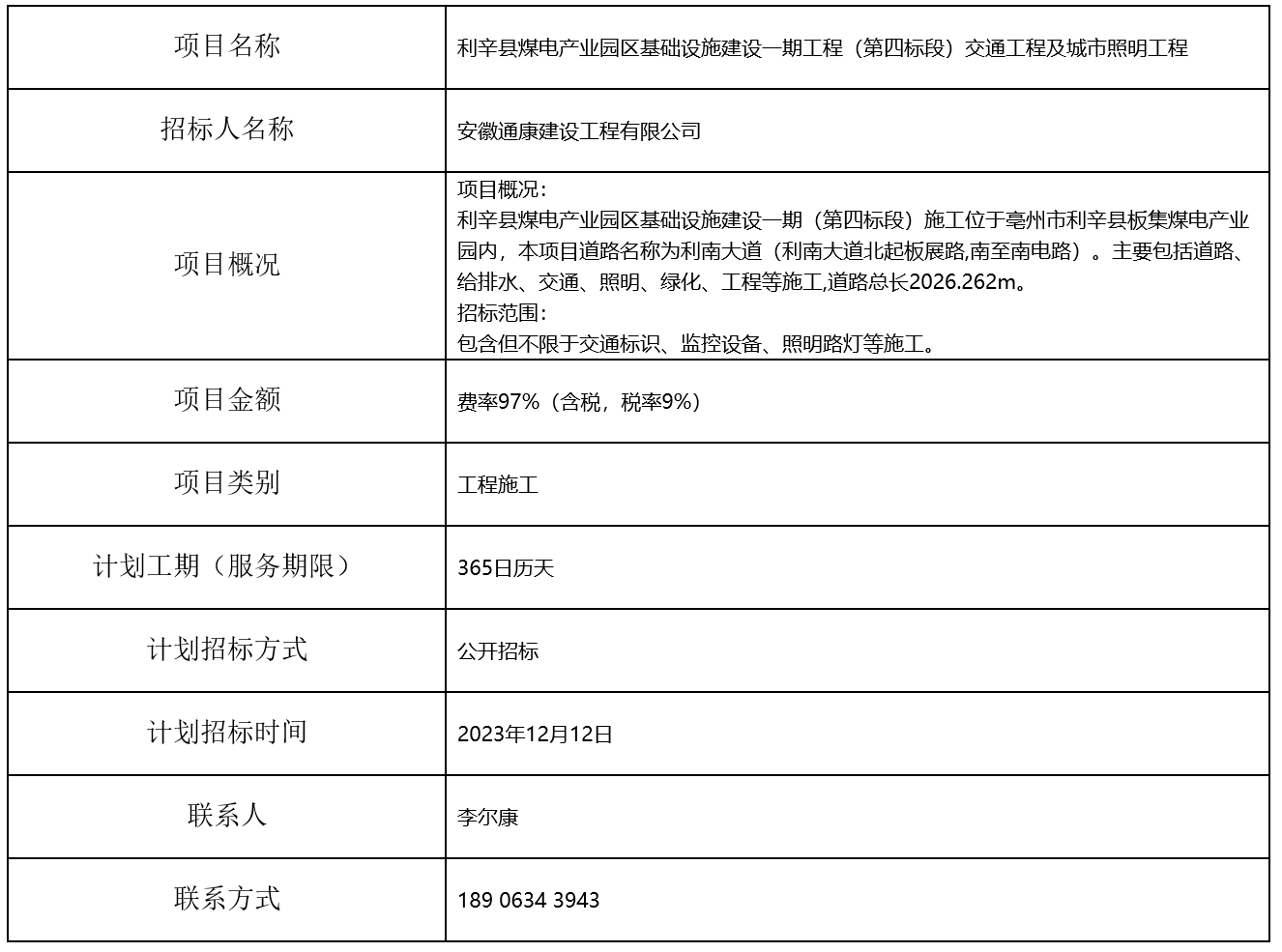 利辛縣煤電產(chǎn)業(yè)園區(qū)基礎(chǔ)設(shè)施建設(shè)一期工程(第四標(biāo)段)交通工程及城市照明工程招標(biāo)計劃