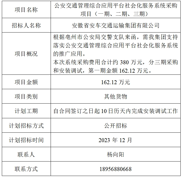 為便于潛在投標(biāo)人及時(shí)了解招標(biāo)信息,現(xiàn)將安徽省安車(chē)交通運(yùn)輸集團(tuán)有限公司(招標(biāo)人名稱(chēng))的招標(biāo)計(jì)劃發(fā)布如下: