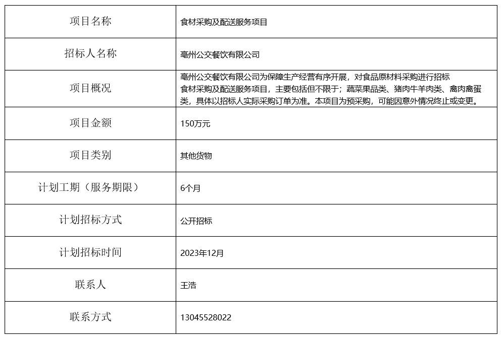 亳州公交餐飲有限公司食材采購及配送服務項目招標計劃