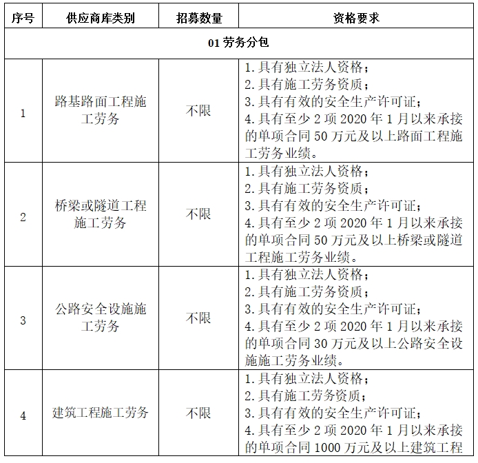 (三)每個(gè)專(zhuān)業(yè)提交一份PDF格式電子文件,文件命名為:公司名稱(chēng)和供應(yīng)商庫(kù)專(zhuān)業(yè)類(lèi)別名稱(chēng)(例如:xx公司-01勞務(wù)分包-01路基路面工程施工勞務(wù))。如申請(qǐng)多個(gè)供應(yīng)商庫(kù)類(lèi)別,申請(qǐng)文件須分別單獨(dú)進(jìn)行制作,匯總發(fā)送1個(gè)郵件,郵件包含多個(gè)附件。如供應(yīng)商未按照要求命名或未分開(kāi)制作申請(qǐng)文件,招募人有權(quán)予以拒收。