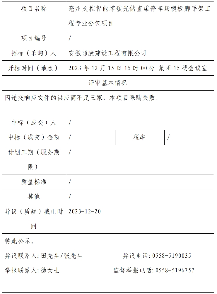 亳州交控智能零碳光儲(chǔ)直柔停車場(chǎng)模板腳手架工程專業(yè)分包項(xiàng)目中標(biāo)(成交)結(jié)果公示