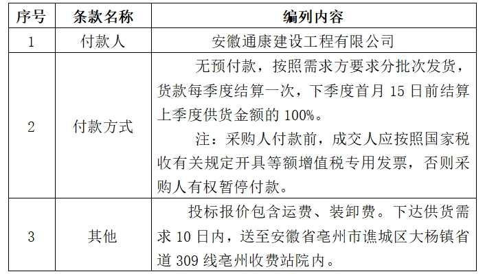 (二)采購范圍:采購白色20%反光型熱熔標線涂料20噸(含20%內(nèi)混珠),下涂劑5噸,20%突起型熱熔涂料50噸,上述采購數(shù)量為暫定數(shù)量,具體數(shù)量以實際使用數(shù)量為準,據(jù)實結(jié)算,供貨產(chǎn)品廠家需提供CMA相關(guān)產(chǎn)品檢測合格報告。