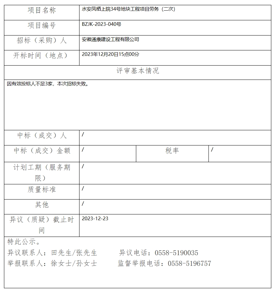 水安鳳棲上院34號(hào)地塊工程項(xiàng)目勞務(wù)(二次)中標(biāo)(成交)結(jié)果公示