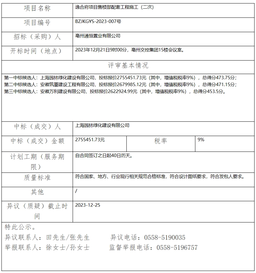 逸合府項目售樓部配套工程施工(二次)中標(成交)結(jié)果公示