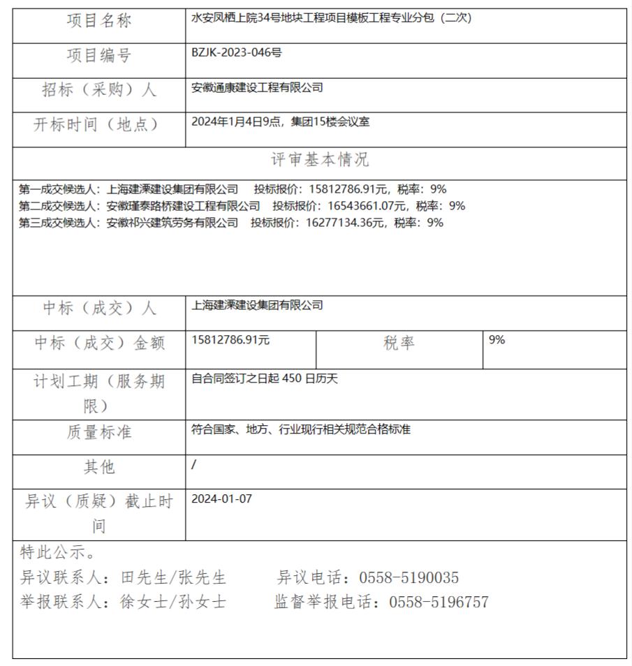 水安鳳棲上院34號(hào)地塊工程項(xiàng)目模板工程專業(yè)分包(二次)中標(biāo)(成交)結(jié)果公示