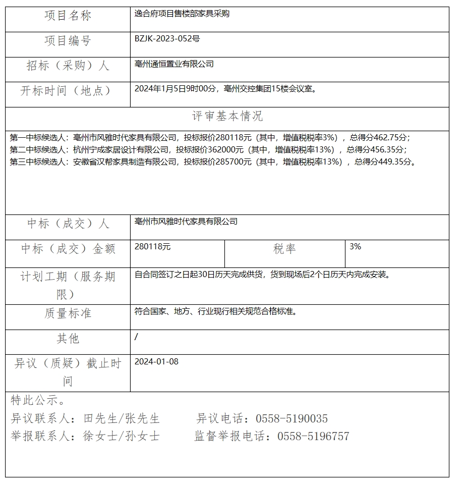 逸合府項目售樓部家具采購中標(biāo)(成交)結(jié)果公示