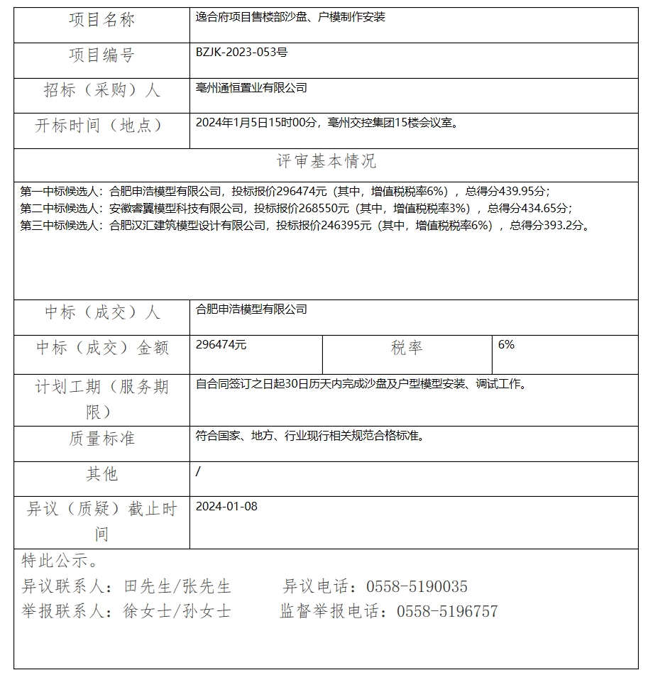 逸合府項目售樓部沙盤、戶模制作安裝中標(成交)結果公示