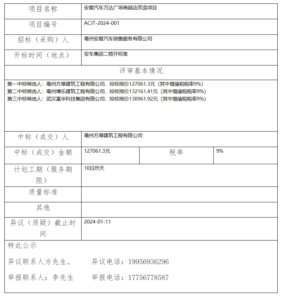 安星汽車萬達(dá)廣場商超店改造項(xiàng)目中標(biāo)(成交)結(jié)果公示