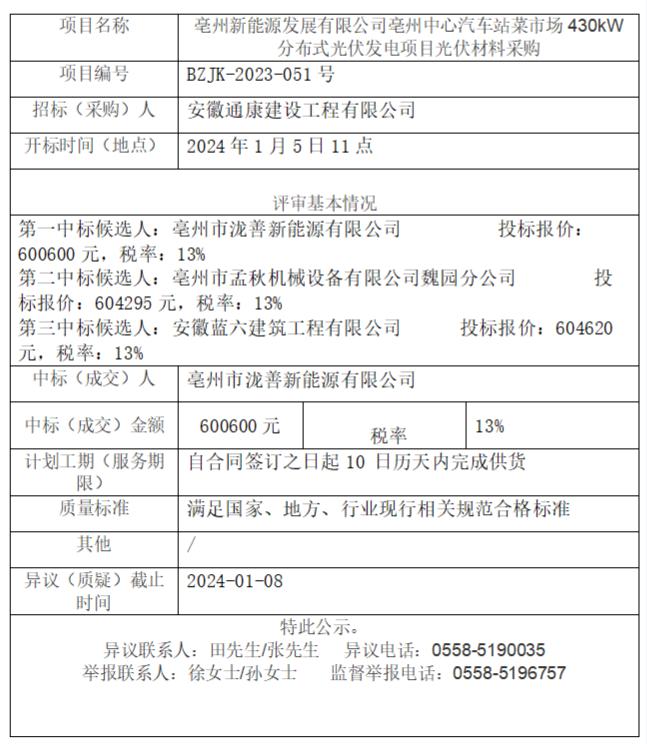 亳州新能源發(fā)展有限公司亳州中心汽車站菜市場430kW分布式光伏發(fā)電項(xiàng)目光伏材料采購中標(biāo)(成交)結(jié)果公示