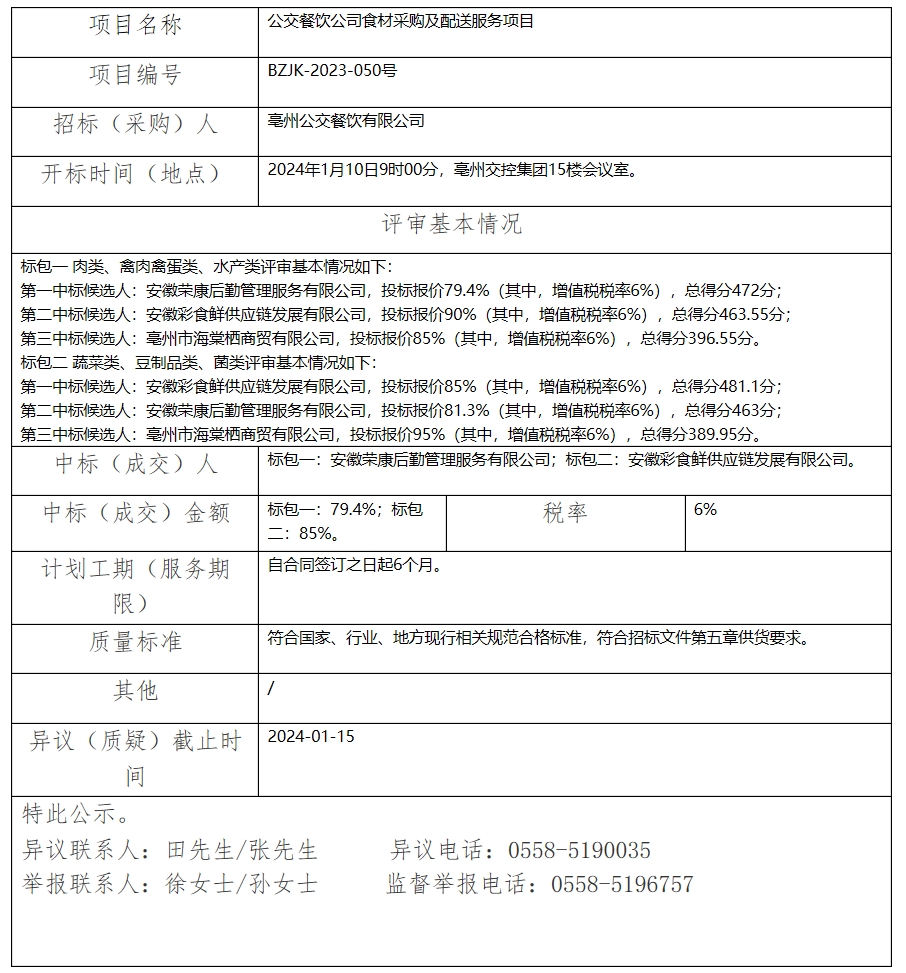 公交餐飲公司食材采購(gòu)及配送服務(wù)項(xiàng)目中標(biāo)(成交)結(jié)果公示