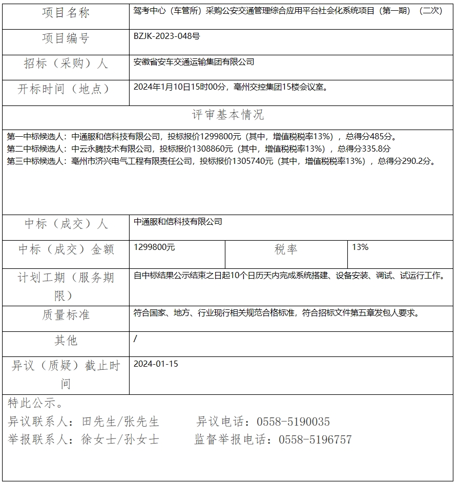 駕考中心(車管所)采購公安交通管理綜合應(yīng)用平臺社會化系統(tǒng)項目(第一期)(二次)中標(biāo)(成交)結(jié)果公示