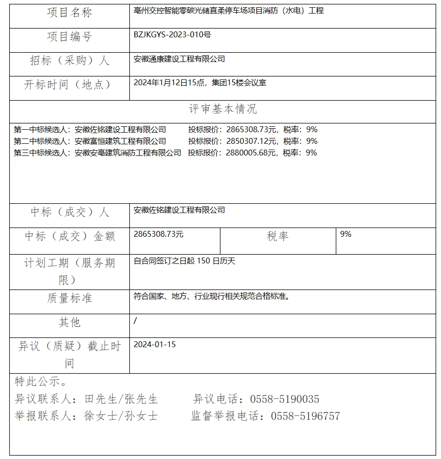亳州交控智能零碳光儲直柔停車場項(xiàng)目消防(水電)工程 中標(biāo)(成交)結(jié)果公示