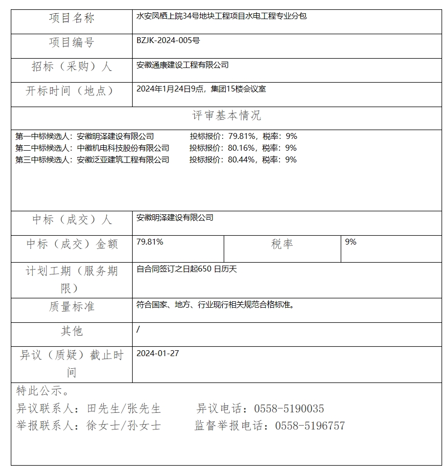水安鳳棲上院34號(hào)地塊工程項(xiàng)目水電工程專業(yè)分包中標(biāo)(成交)結(jié)果公示