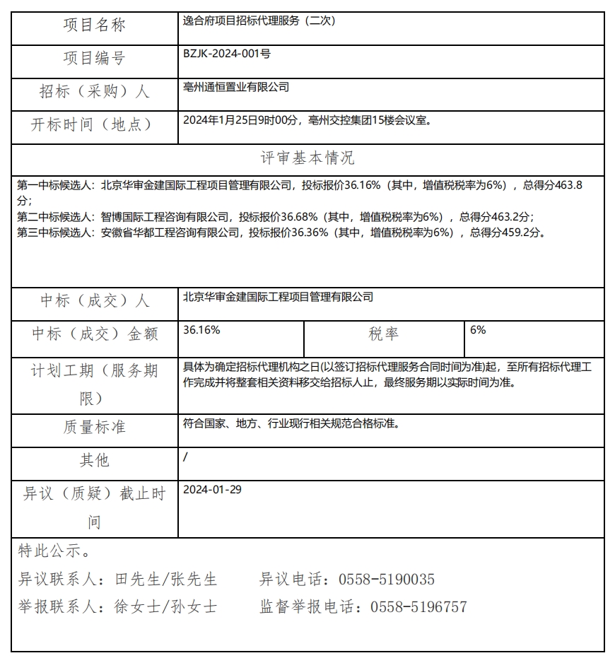 逸合府項目招標代理服務(wù)(二次)中標(成交)結(jié)果公示