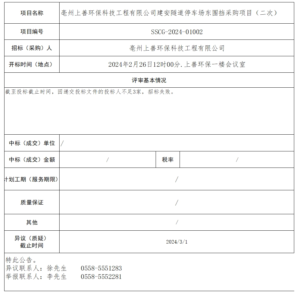 亳州上善環(huán)保科技工程有限公司建安隧道停車場(chǎng)東圍擋采購(gòu)項(xiàng)目(二次)中標(biāo)結(jié)果公示